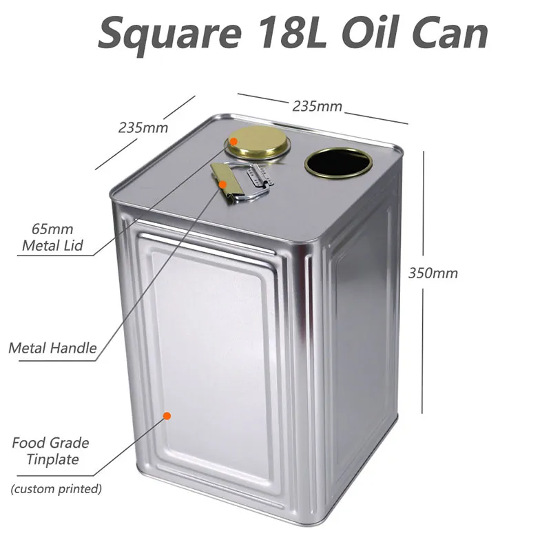 Откройте для себя наши квадратные 18-литровые канистры для масла, изготовленные из пищевой жести и идеально подходящие для оливкового и других растительных масел. Возможна индивидуализация с печатью CMYK. Напрямую с завода по оптовым ценам с быстрой доставкой.