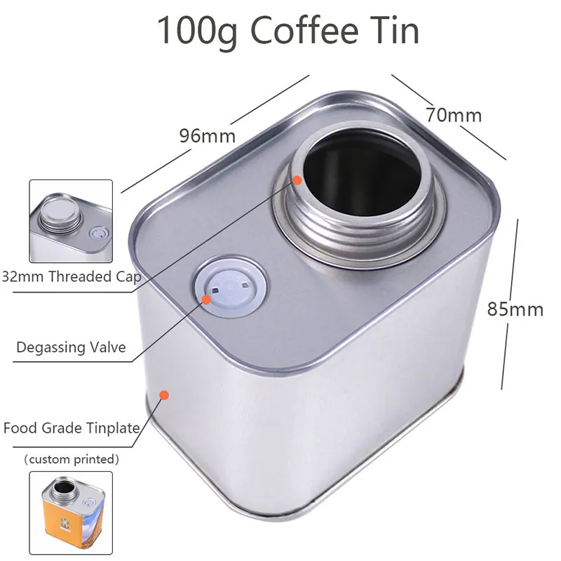 Пользовательские банки для кофейных зерен имеют размер 96*70*85 мм, идеально вмещают 100 г кофейных зерен. Эта квадратная жестяная банка оснащена односторонним дегазационным клапаном для сохранения вкуса и свежести ваших кофейных зерен.