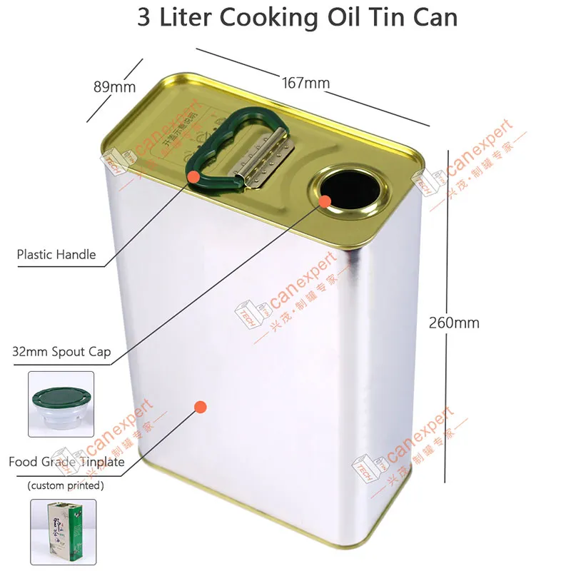 Изучите нашу коллекцию высококачественных 3-литровых печатных квадратных пустых банок для растительного масла оптом, оснащенных удобным 32-миллиметровым гибким носиком. Идеально подходящие для кухонного растительного масла, эти жестяные банки от TCE-Tin Can Expert настраиваемы, долговечны и безопасны для пищевых продуктов.